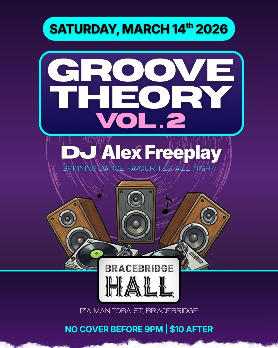 Groove Theory Dance Party DJ Alex Freeplay Jams Saturday March 14 Playing your favourite old school, hip hop, rnb, classic house and indie sleaze to make you move on the floor. $10 after 9pm At the door